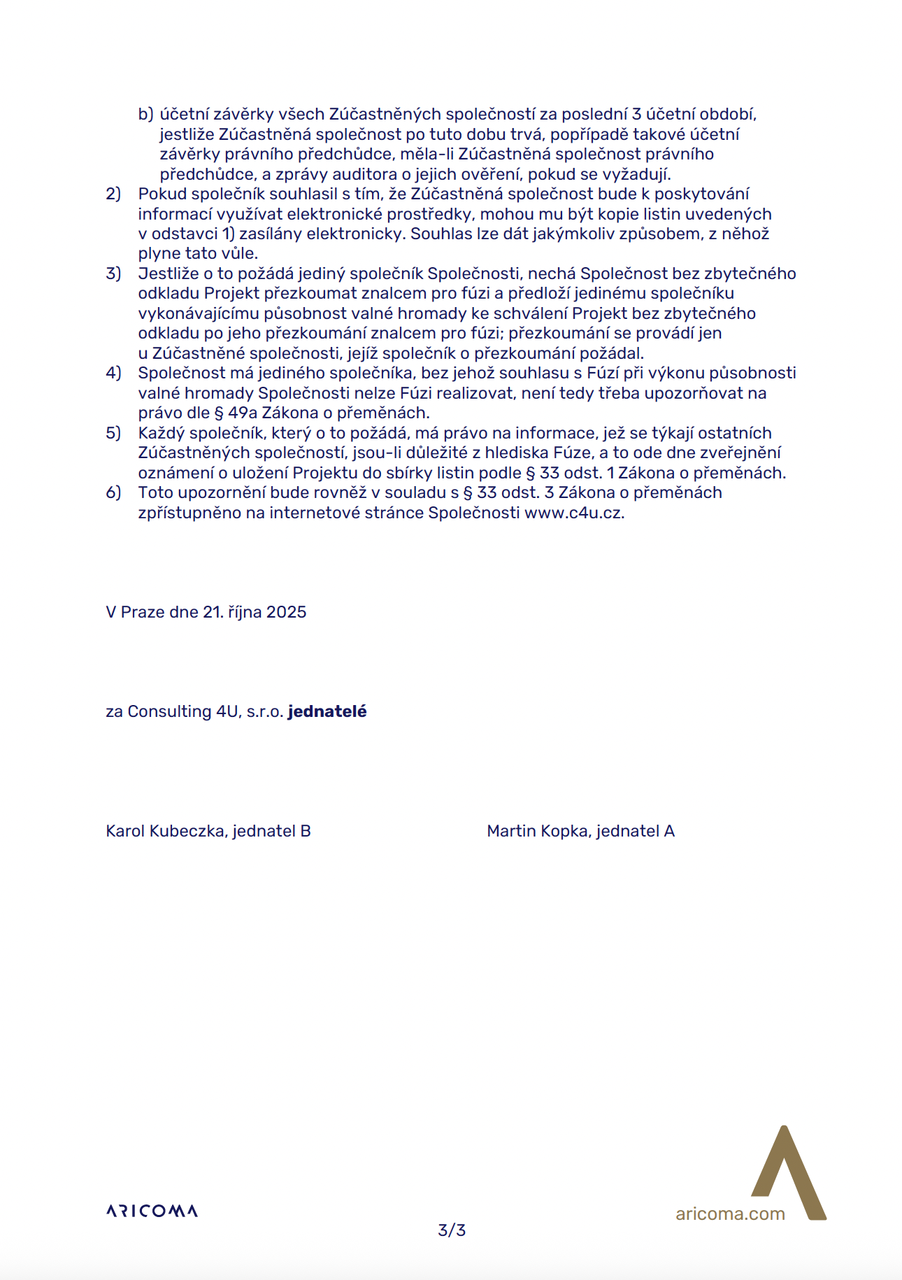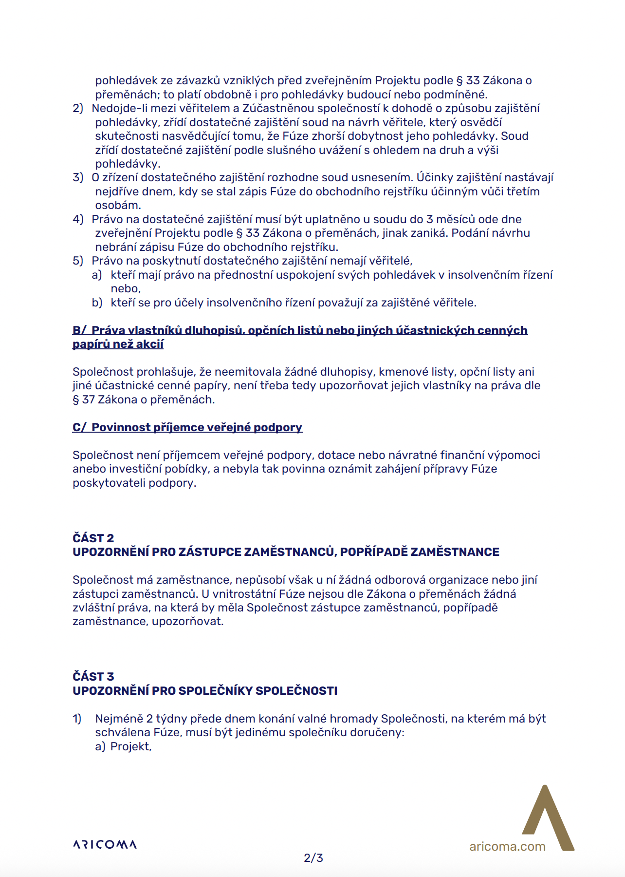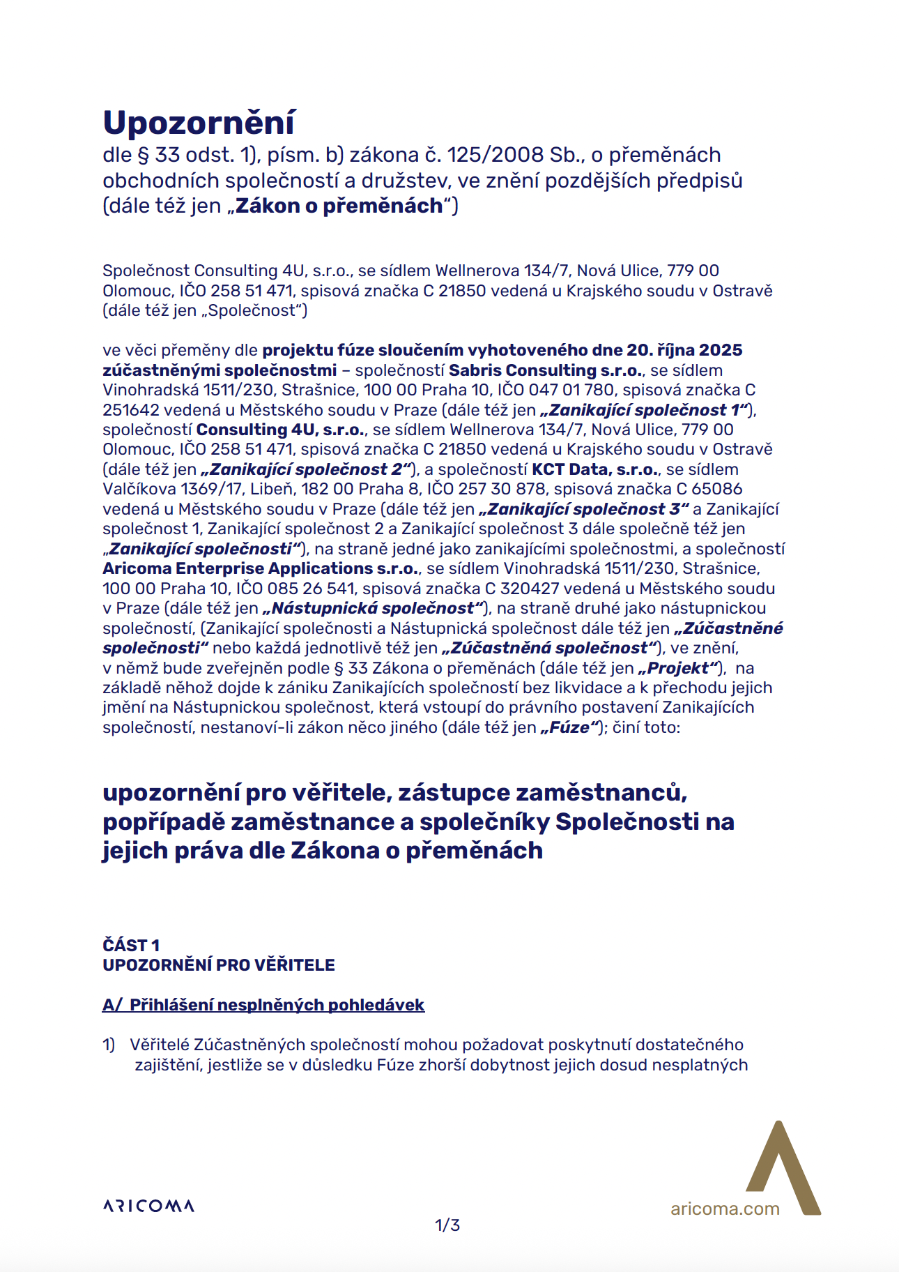 Upozornění pro věřitele, zástupce zaměstnanců, popřípadě zaměstnance a společníky Společnosti na jejich práva dle Zákona o přeměnách.